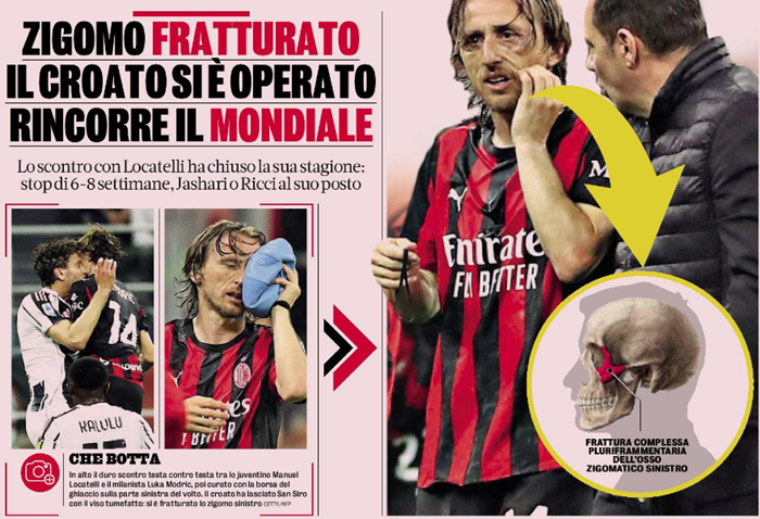Un golpe terrible. Para Luka Modric, que el domingo por la noche abandonó San Siro con el rostro hinchado tras el terrible choque cabeza contra cabeza con Manuel Locatelli en la segunda parte del Milan-Juventus. Pero también para el “Diavolo”, que tras los exámenes de ayer por la mañana perderá al campeón croata hasta el final de la temporada. «Fractura compleja plurifragmentaria del hueso cigomático izquierdo», reza el boletín médico difundido por el Milan.